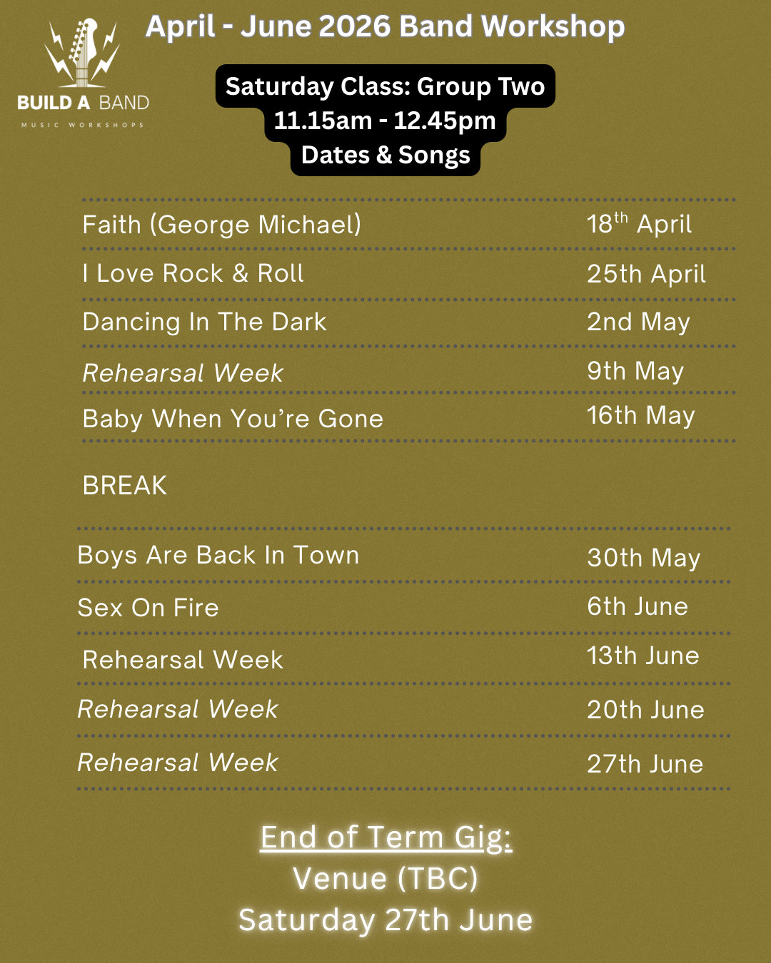 We will aim to cover a new song each week. We take time to talk through the song, discuss the parts and then perform it together, as a band.